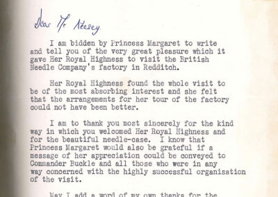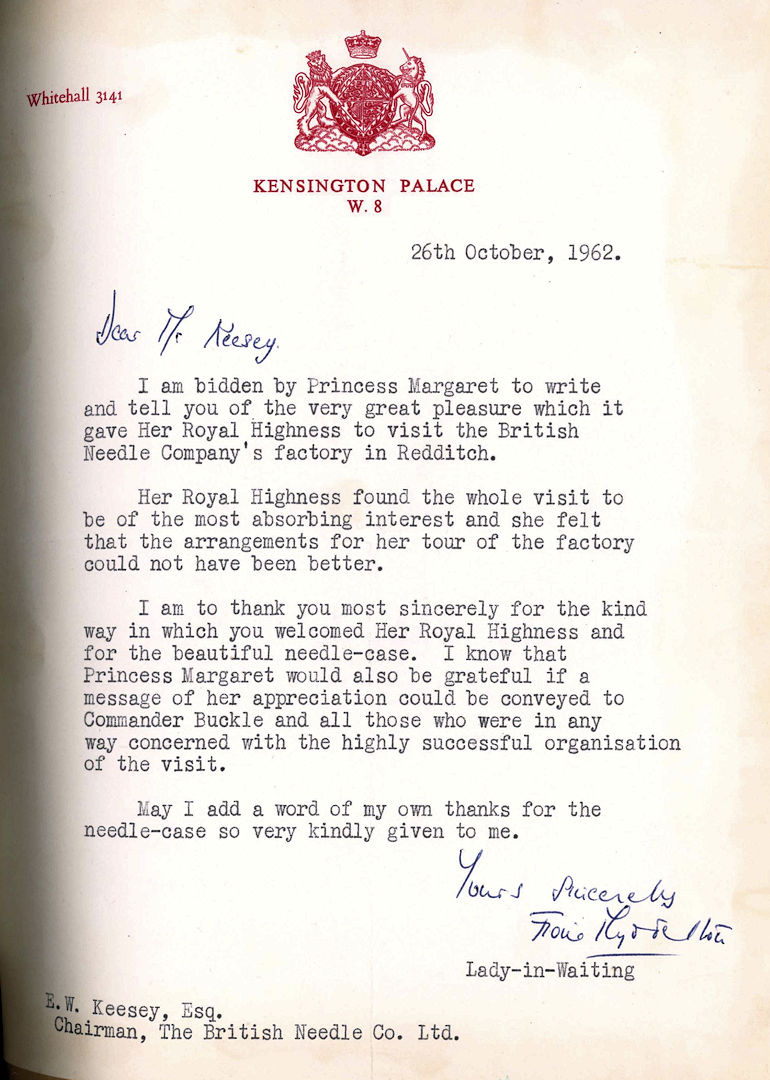 Princess Margaret visited Redditch and was given a tour of the British Needle Company on 23 October 1962.