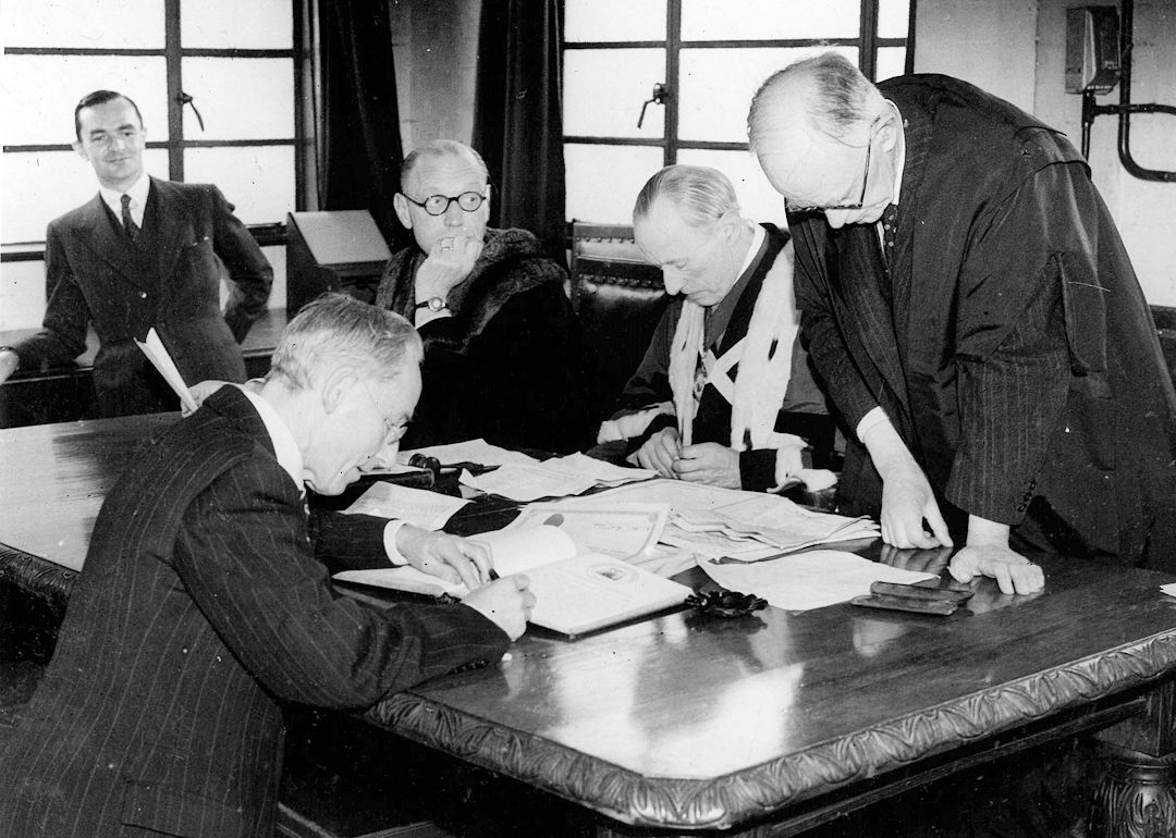2) Mr George Horton signing his name on being made an Honorary Liveryman of the Worshipful Company of Needlemakers when the Livery came to Redditch on 23 May 1946.  Mr Horton joined the company in September 1945 and was previously a needle finisher at Woodfield’s needle factory. From left to right: Mr L Beare, director and secretary of the English Needle and Fishing Tackle Company; Captain H W Dennis, Senior warden of the WCNM; Mr Frank Gibbs Rye, Master of the WCNM; and Mr C D King Farlow, Clerk to the WCNM. 1946