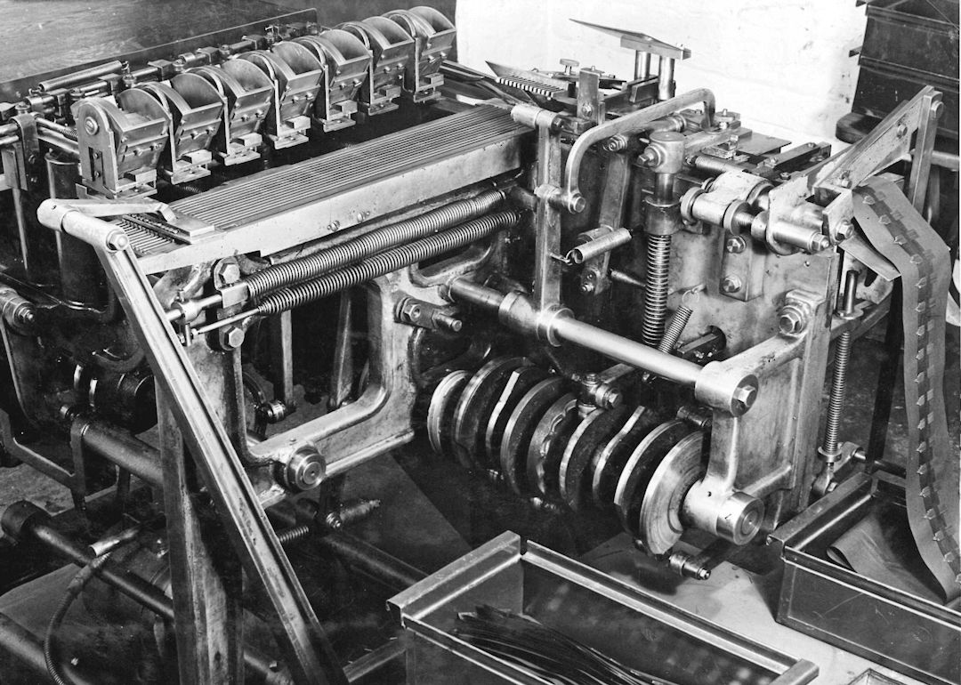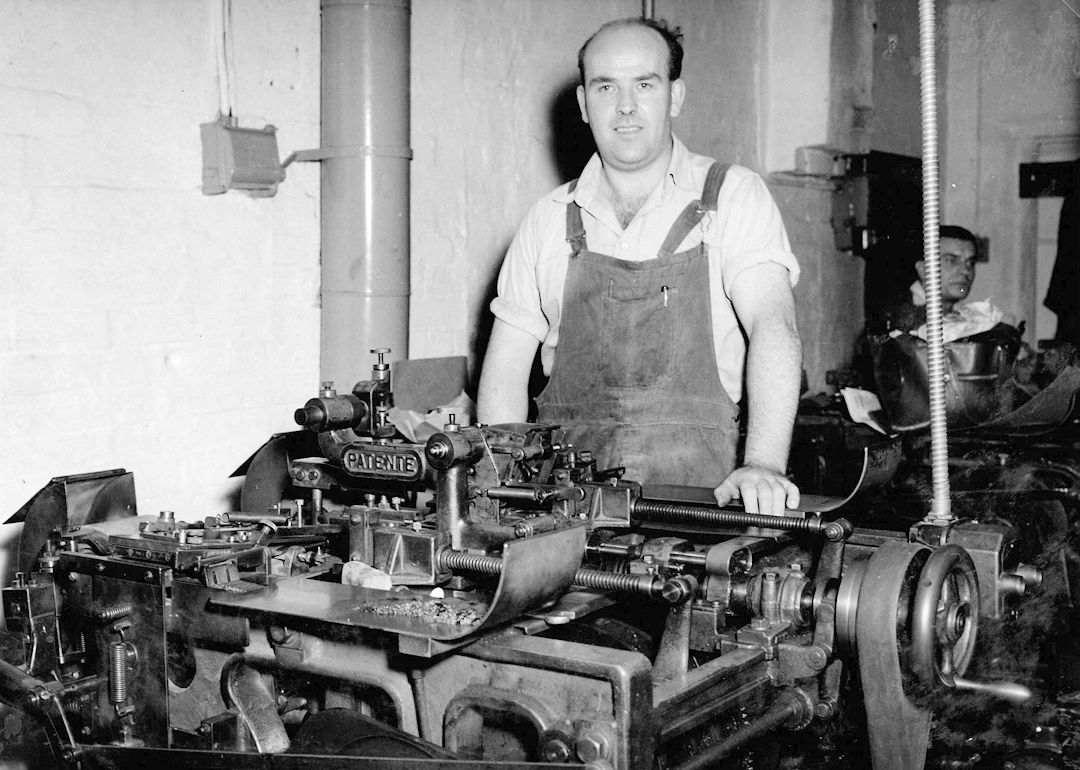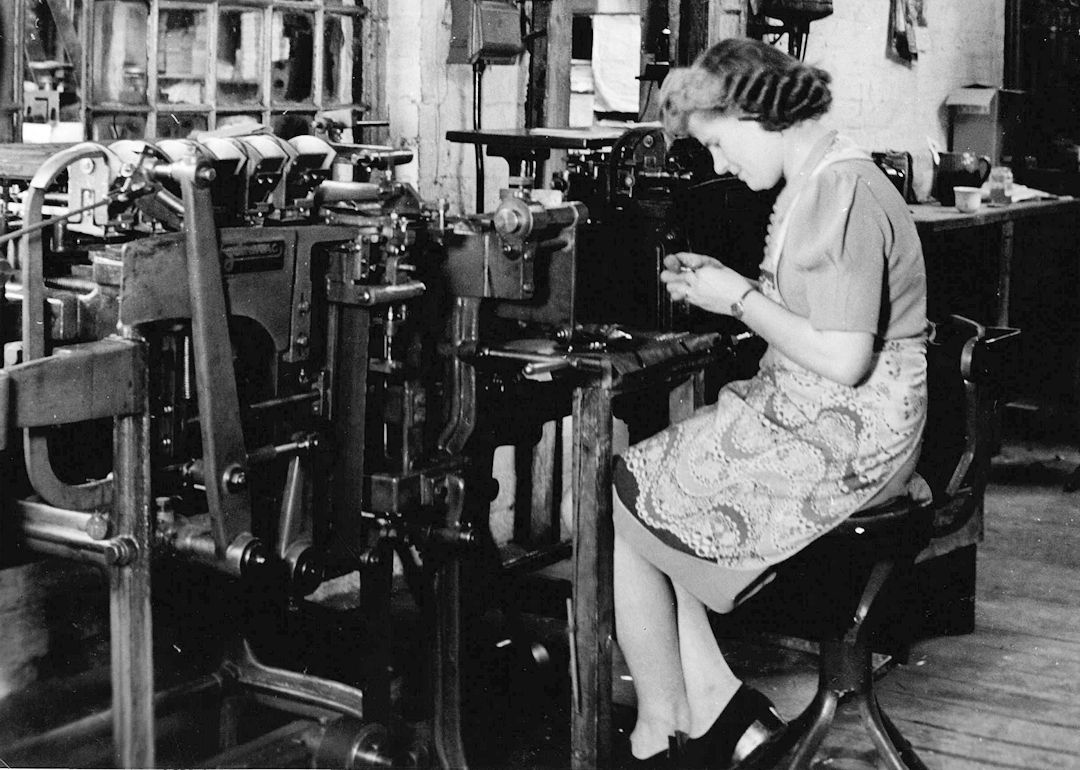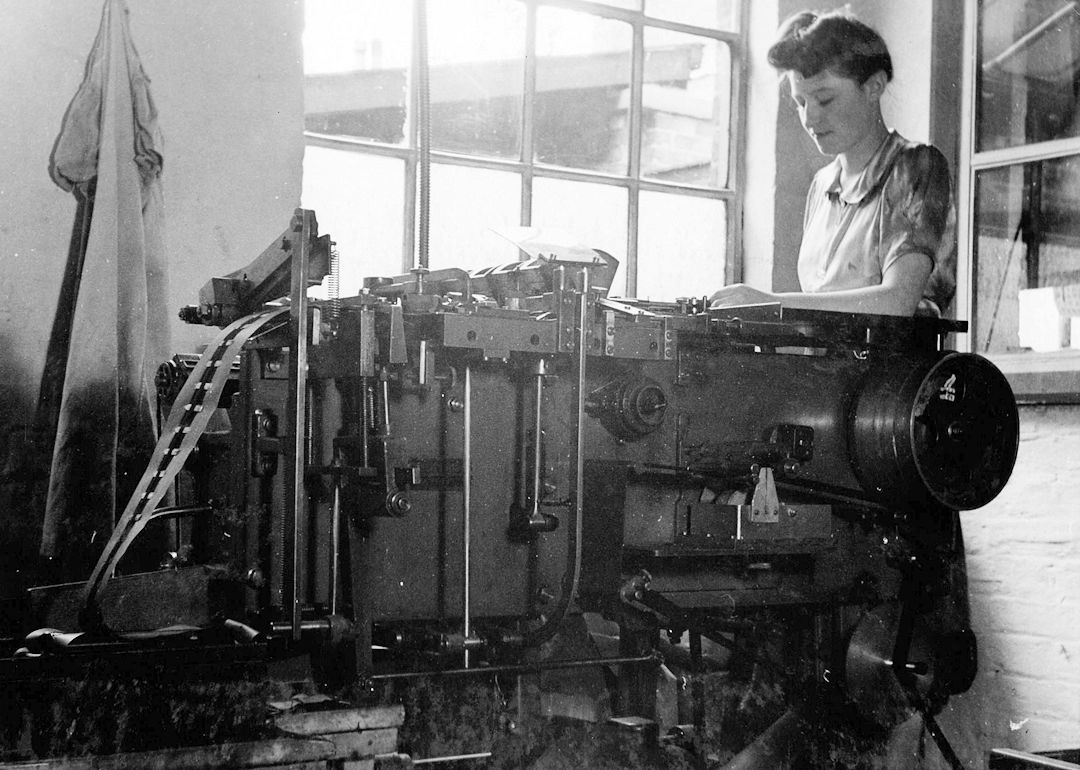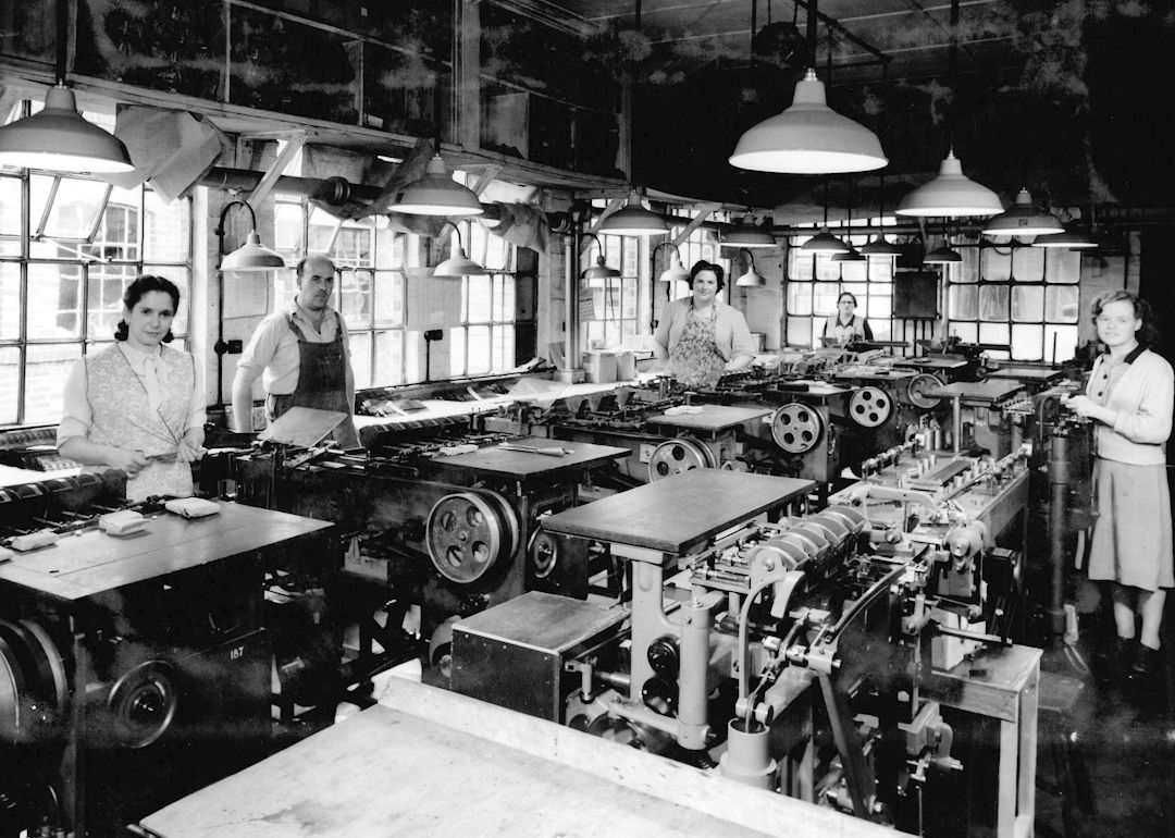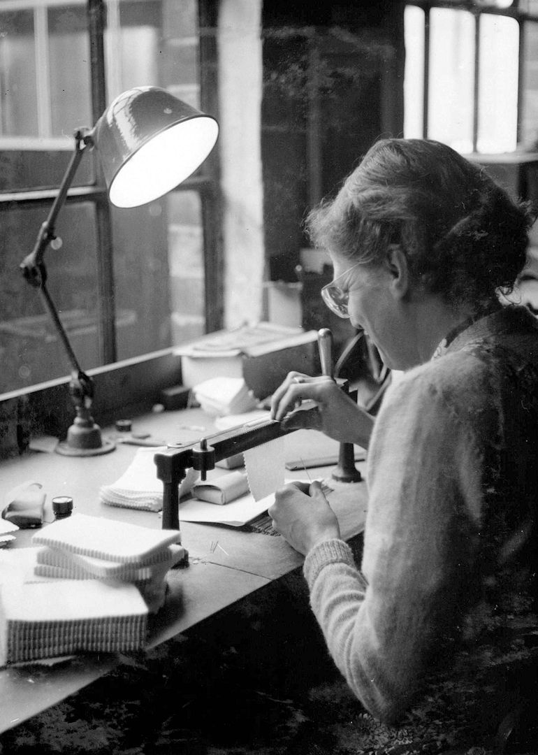 The needles are ‘stuck’ into cloth strips prior to being put into packets. This process was originally done by hand, but later a machine did the job.