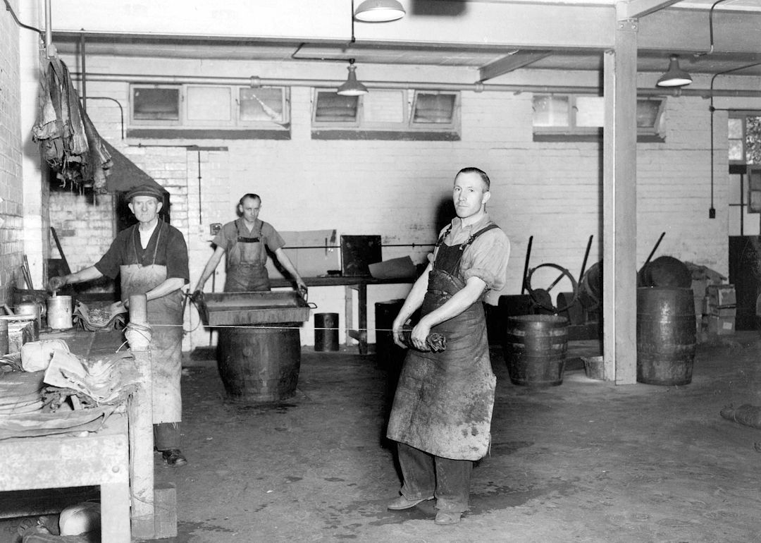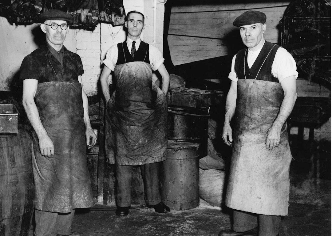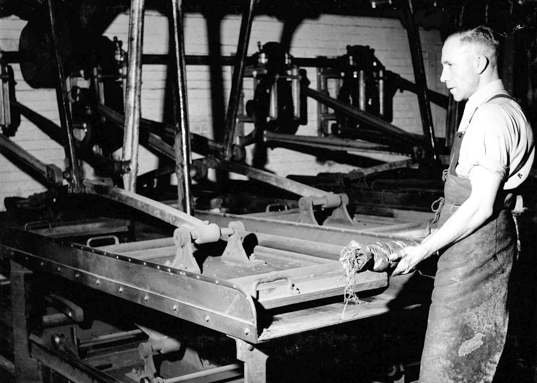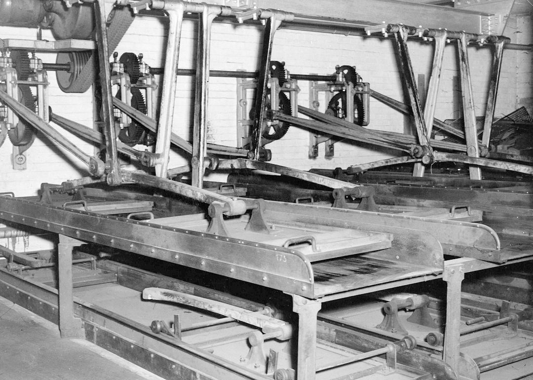 1) The new scouring mill, built in 1947/48 and first used when it was loaned to Brabant Needle Company in January 1948 because their own mill had broken down. The machinery was built by Llewellyn & Co. The bottom runners are equipped with a lever which raised them a few inches, thus facilitating access to the back. 1950