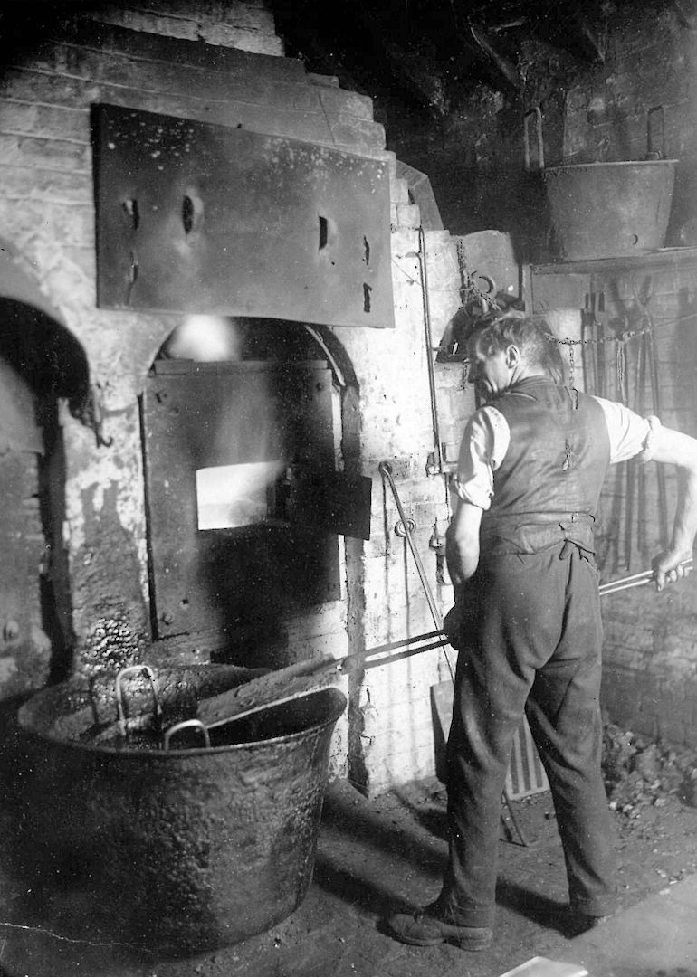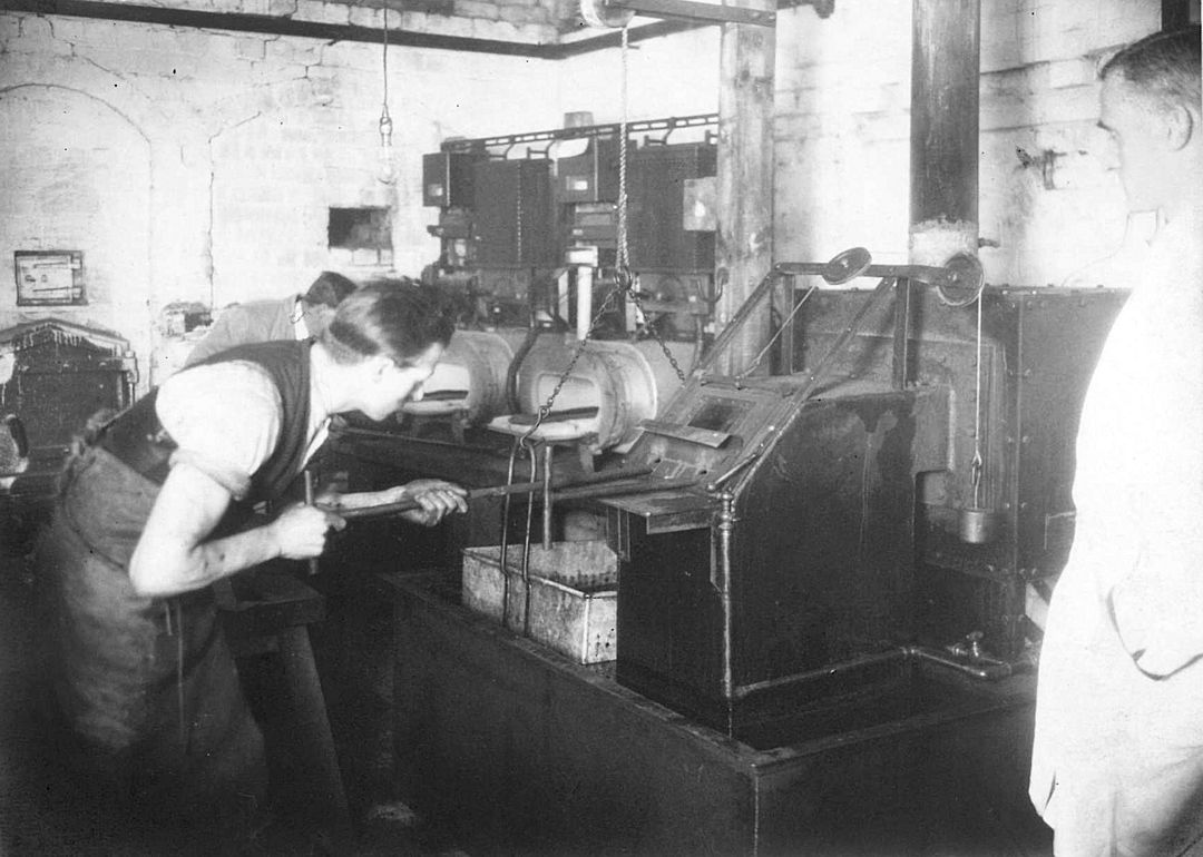 1) George Charman is pictured quenching a pan of needles which have just been heated in one of the coal-fired furnaces. These furnaces were used before gas-fired furnaces were installed in 1926 as a result of the coal strike. 1925