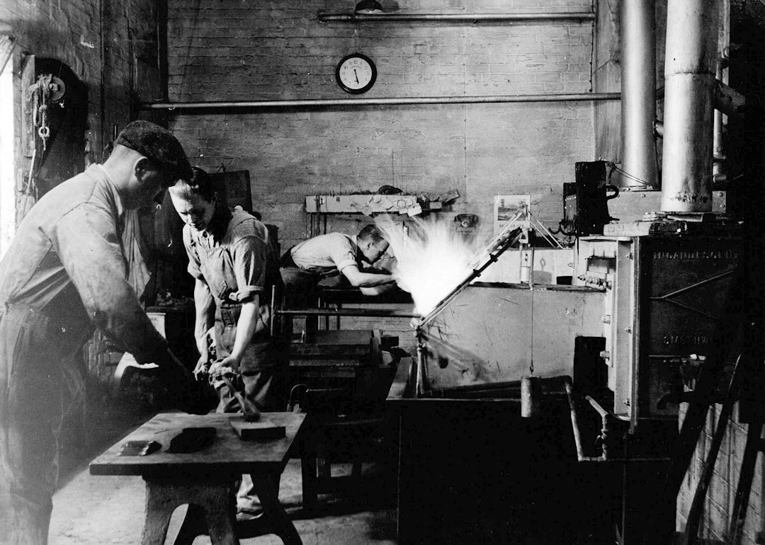 2) Note the coal-fired furnaces on the far wall, which were built when the Hardening shop was erected in 1925 but hardly ever used. Image shows H J Paramore, Ray Charman and E W Keesey. 1930