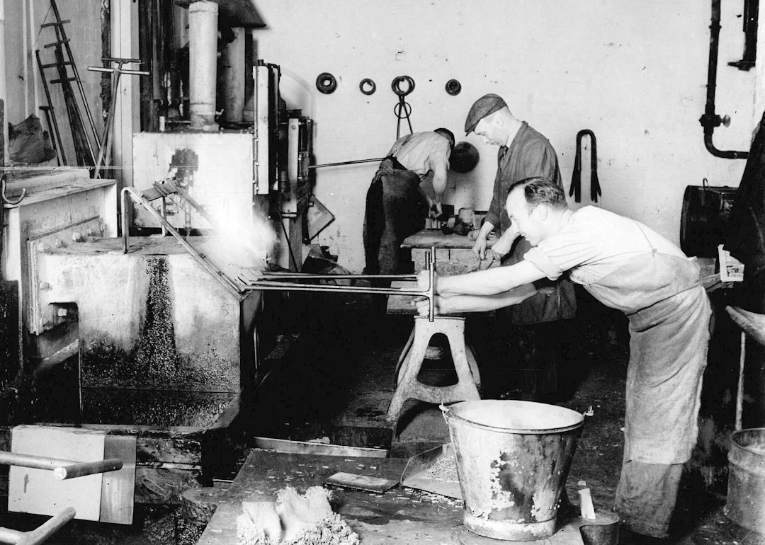 3) Image shows Charlie Charman placing needles in a hardening pan held by Fred Tarrant. Ray Charman is looking into one of the gas-fired furnaces. 1946